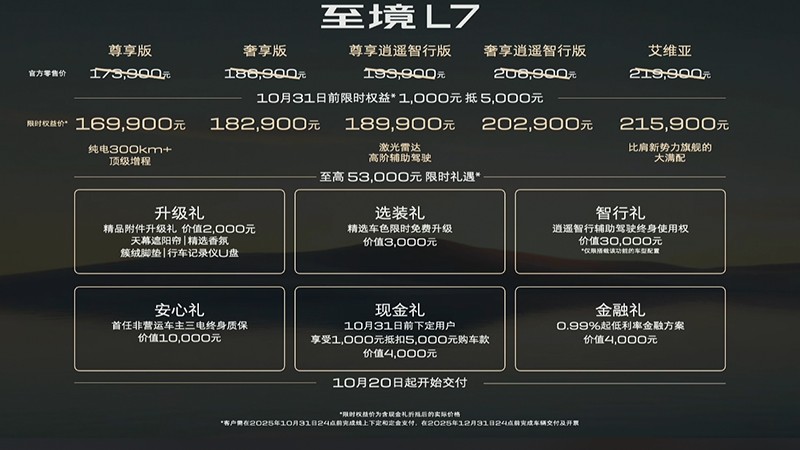 至境L7的定价策略延续了燃油车的思维,用低配拉低起售价,留一到两个明显有性价比的配置来做主销。虽说至境L7的起售价来到了17万内,实际上是想用高配去打同级20万以上的车型。薛海涛在发布会结束后说,“新势力的入门价格,就可以拿到至境L7的顶配”。