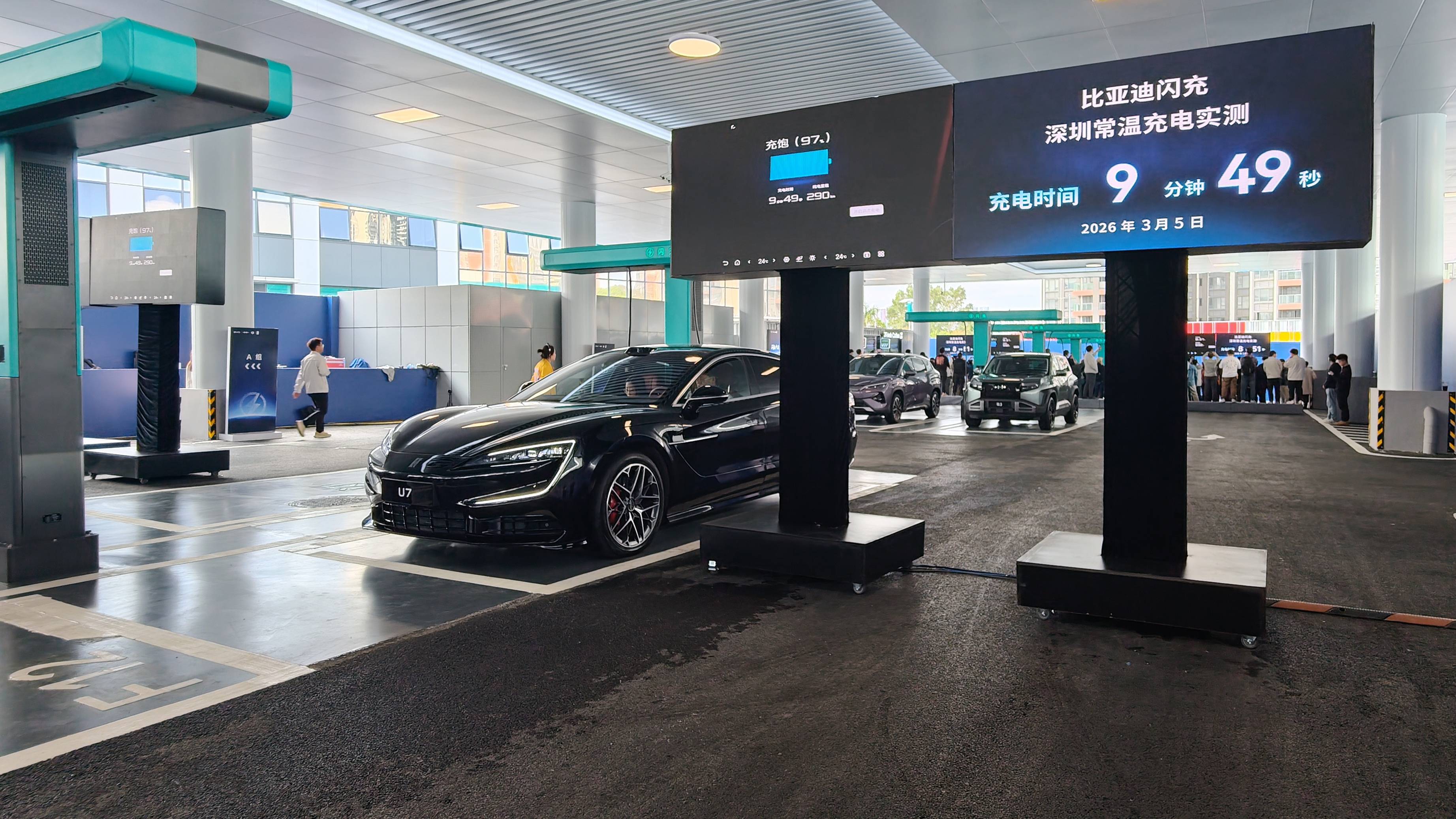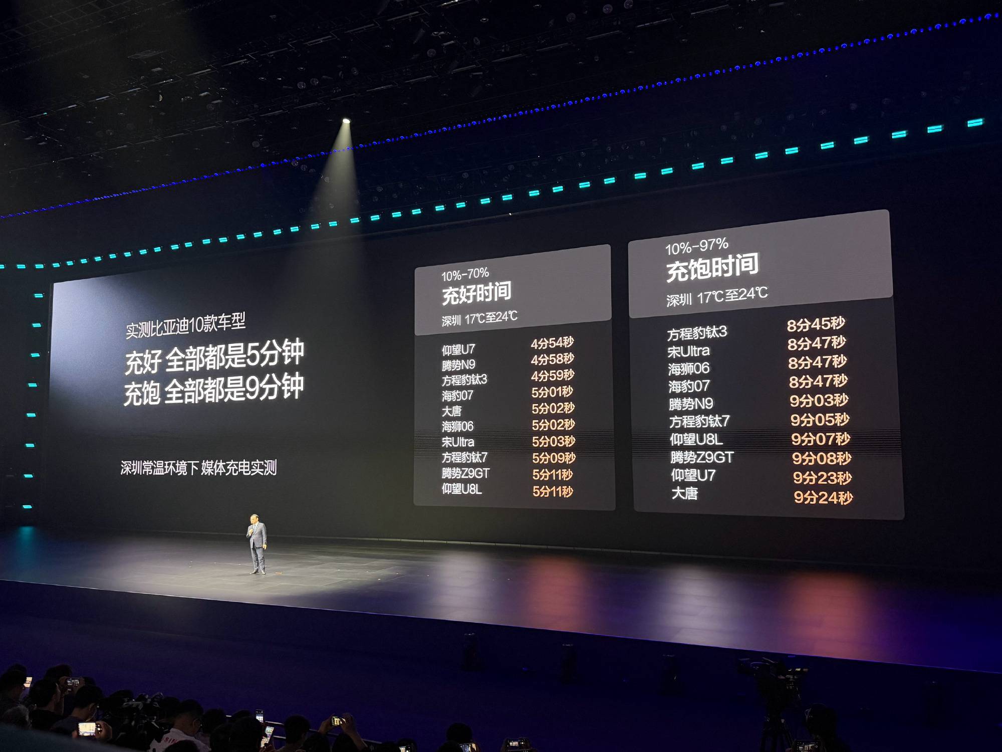 比如,5分钟充好,9分钟充饱是有小幅区别的。首先是,不同车型的速度其实是有所差异,电池越小充电越快,同时还有一个关键点是,纯电车型的充电速度相比插混明显更快一些。再比如,能量密度提升5%看似不大,但比亚迪是通过系统效率的提升,把续航提升到了市面头部三元锂电池的水平,充电效率则是反超三元锂。纯电车型续航突破1000公里,目前手握着不止1款,而是仰望U7、腾势Z9、腾势Z9 GT三款。