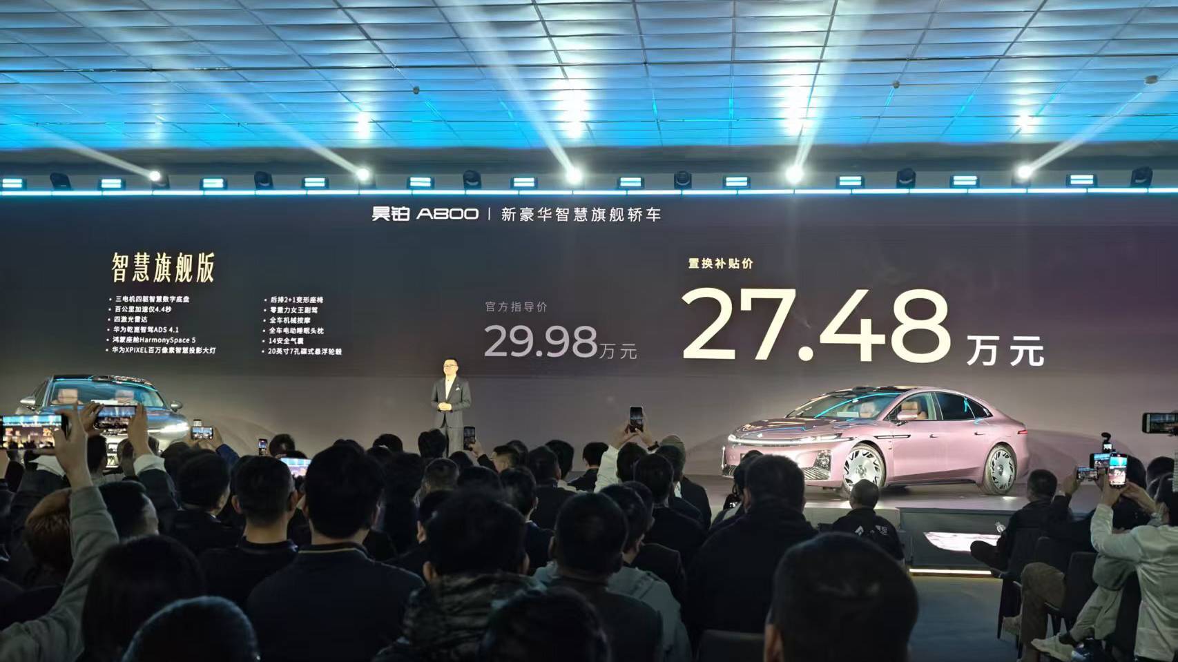 参照物是不久前同样和华为深度合作的昊铂A800的顶配版本,其售价为29.98万元。也就是说,在广汽的现有体系下,三电机+896线激光雷达的最新方案,它能够做到30万元以内。