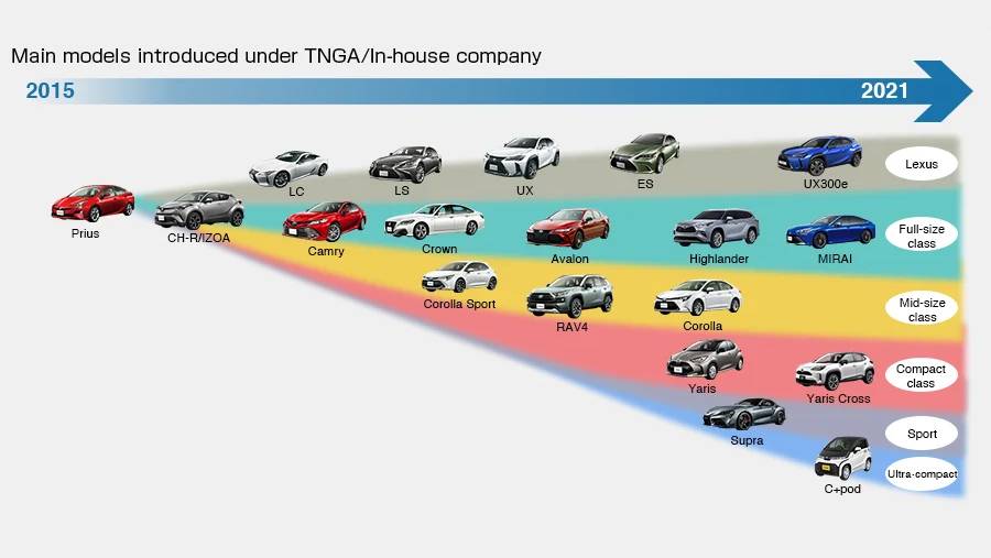 技术深度上,其实还是老话题。汽车自从诞生至今,研发和生产制造方式一直在被重新优化。初始是福特的流水线,落点是提升制造效率和降低成本;之后是大众的MQB,用模块化的方式提升整体效率和降低成本;再之后是丰田的TNGA,是进入分子层,把之前所有平台上的优秀技术挑出来,最终在低端、中端、高端上进行分别的组合,比较大幅度的完成下限的提升。