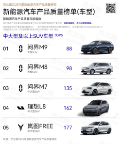 这份对质量的坚守,也获得了权威机构的认可,在杰兰路《2025年度新能源汽车产品质量研究报告》中,问界荣登新能源汽车产品质量榜单(品牌)第一,其旗下车型问界M9、问界M8、问界M7更在新能源汽车产品质量榜单(车型)中包揽中大型及以上SUV车型前三名。